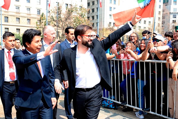 El presidente de la República, Pedro Castillo, junto a su homólogo Gabriel Boric se dieron su baño de popularidad en los exteriores del Palacio de la Moneda en Chile.