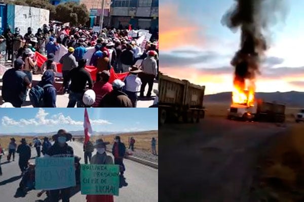 "Ambas unidades fueron quemadas, mientras que otros vehículos que formaban parte del mismo convoy fueron apedreados, luego que un grupo de manifestantes bloquearan la carretera; ellos exigen de manera violenta un beneficio económico que no está vinculado a la minera Las Bambas y han causado disturbios en la zona", denunció la minera.