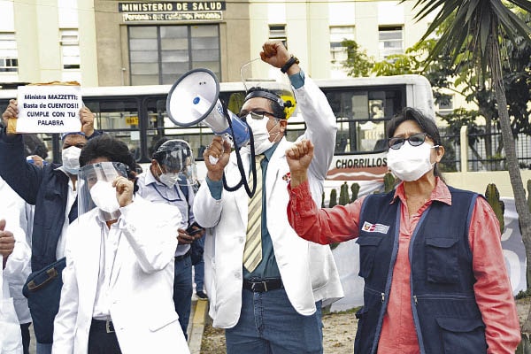 “Desde 2016 votamos por un incremento de sueldo de un 5%. En estos últimos cuatro años se aumentó en un 0.20% y ahora en un 0.12% (...) Tenemos menos de la mitad del presupuesto para el sector salud comparado con América Latina, por eso iniciamos la huelga”, dijo Godofredo Talavera, presidente de la FMP.