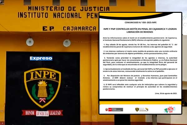El Instituto Nacional Penitenciario (INPE) confirmó que retomó el control del penal de Cajamarca tras un motín protagonizado por internos del pabellón N.º 5, quienes redujeron a dos agentes penitenciarios como rehenes durante la mañana de este sábado.
