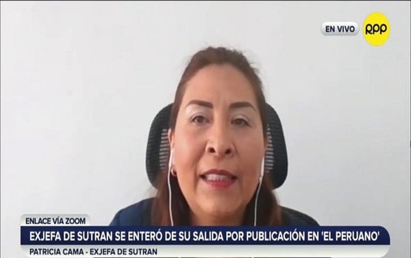 La exjefa de la Superintendencia de Transporte Terrestre de Personas, Carga y Mercancías (Sutran), Patricia Cama, indicó que se enteró del cese de su cargo a través de las normas legales del diario oficial El Peruano cuando se dirigía al aeropuerto para viajar a Arequipa, donde iba a participar de una exposición sobre seguridad vial.