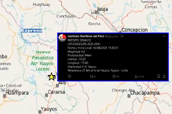 Un movimiento telúrico de magnitud 4.3 sorprendió la noche de este sábado a los habitantes de la provincia de Yauyos, en la región Lima.