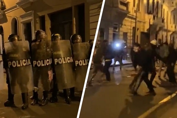 Los sujetos tenían cubiertos sus rostros y, entre insultos, intentaron romper el cordón policial que no permitía el acceso de estos en una zona del jirón Carabaya, en el Centro de Lima. El hecho aconteció en horas de la noche, cuando el ministro del Interior, Vicente Romero, brindaba un balance sobre los heridos y detenidos en la 'Tercera Toma de Lima'.