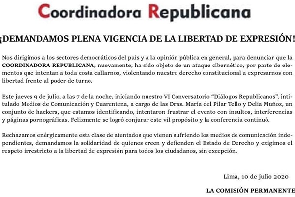 La Coordinadora Republicana (CR) denunció, en la víspera, un nuevo ataque cibernético por parte de hackers que intentaron frustrar una conferencia a cargo de las doctoras María del Pilar Tello y Delia Muñoz.