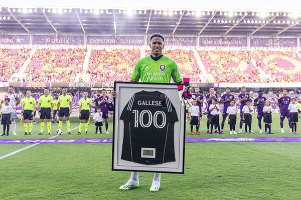 “Antes de iniciar el partido, celebramos con Pedro Gallese por haber alcanzado los 100 partidos con nuestro club”, se lee en las redes sociales de Orlando City junto a una foto de Pedro Gallese con una camiseta con el dorsal 100.