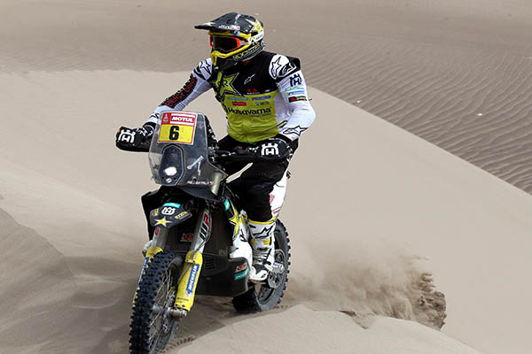 El chileno Pablo Quintanilla (Husqvarna) se impuso ayer en la sexta etapa del Rally Dakar 2019, que unió las ciudades de Arequipa y San Juan de Marcona. El piloto sudamericano no solo se llevó la victoria por delante del estadounidense Ricky Brabec (Honda) sino que recuperó el primer lugar en la clasificación general de la categoría motos, con 4 minutos y 38 segundos de ventaja sobre el norteamericano.