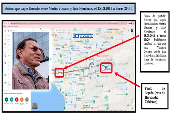“Se ha podido determinar la ubicación del número XXXX en tiempo real, que utilizaba Vizcarra Cornejo, esto es, se ha podido determinar que, antes de dirigirse a casa de José Manuel Hernández Calderón el 25 de agosto de 2016 en horas de la noche, ubicada en Condominio San Francisco de la Laguna de la Molina, realizó dos llamadas que ponen en evidencia su participación de dicha reunión”, se lee.
