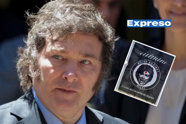 En uno de estos afiches se logra ver la cara de Javier Milei y una mancha de sangre en la frente, haciendo referencia a un disparo en la cabeza. En otro se ve al jefe de Estado de Argentina colgado de los pies y acompañado de la oración ‘El ruido será la tumba del fascismo’.