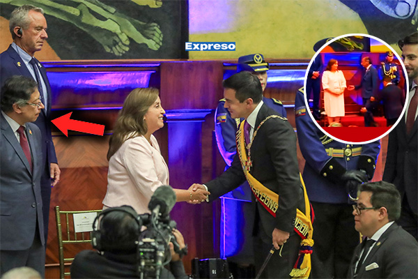 La presidenta Dina Boluarte, evitó estrechar la mano del mandatario colombiano, Gustavo Petro, durante la ceremonia de toma de mando del nuevo presidente de Ecuador, Daniel Noboa, desarrollada en Quito.