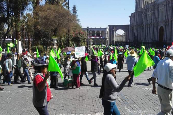 Durante el tercer día de paro indefinido, los manifestantes se movilizaron hasta la Plaza de Armas de Arequipa para continuar con las protestas en rechazo a la ejecución del proyecto minero Tía María a cargo de la minera Southern Cooper.