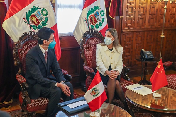 La presidenta del Congreso, María del Carmen Alva, se reunió, en su despacho, con el embajador de la República Popular China en Perú, Liang Yu, con quien sostuvo un diálogo en torno al fortalecimiento de los lazos amicales entre ambos países, en el marco del Bicentenario de la Independencia nacional y el 50° aniversario de las relaciones Perú-China.
