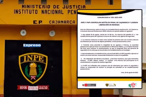 Imagen Actualidad 5 Sep 2025 - 05:13 Ronderos de Cajamarca se enfrentan a extorsionadores tras amenaza de "guerra" Vigilantes comunales no se amilanan ante criminalidad. Redacción Expreso Imagen Actualidad 30 Ago 2025 - 16:58 Motín en penal de Cajamarca: INPE confirma control de situación y liberación de agentes Operativo conjunto impidió que la revuelta se expandiera a otros pabellones del penal. Martín Villacís Imagen Actualidad 28 Ago 2025 - 06:45 En Cajamarca, queman brazos y piernas de policías para evitar desalojo: detalles de la violenta jornada ¿Qué desató el ataque de violentas personas? Redacción Expreso Imagen Judicial 16 Ago 2025 - 17:14 Cajamarca: PJ ordena cárcel para trabajadores por colusión en Mercado Zonal Sur Fiscalía destacó que esta condena reafirma necesidad de vigilar ejecución de obras públicas. Redacción Expreso Imagen Actualidad 11 Jun 2025 - 08:46 Corredor Vial Cajamarca - La Libertad, mantenimiento frenado: residentes exigen acciones de control Piden que se ponga fin a postergaciones e indiferencia. Harold Salinas Imagen Actualidad 6 May 2025 - 17:09 Cajamarca en crisis: lluvias dejan 12 muertos y un niño desaparecido Autoridades reportan daños en infraestructura vial, desbordes y comunidades incomunicadas. Martín Villacís Imagen Actualidad 3 May 2025 - 15:39 Se inicia construcción del Nuevo Hospital Simón Bolívar en Cajamarca Nosocomio contará con 20 mil metros cuadrados. Redacción Expreso Imagen Actualidad 2 May 2025 - 07:40 Cajamarca: Personal de centro de salud recibe amenazas de muerte por parte de criminales Un mensaje intimidatorio pone en peligro a trabajadores. Fanni López Cargar más PUBLICIDAD