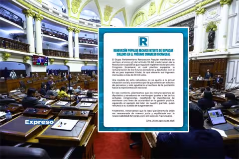 Imagen Política 29 Ago 2025 - 11:28 Alejandro Muñante exige a Sunarp frenar registros de matrimonios LGBT celebrados en el extranjero: ¿qué argumenta? Legislador solicita explicación inmediata tras polémica resolución que cuestiona principios jurídicos nacionales. Imagen Política 20 Ago 2025 - 11:19 Renovación Popular rechaza sueldos de 35 mil soles en próximo Congreso bicameral: puntos principales de comunicado La bancada criticó predictamen que busca equiparar salarios a jueces supremos. Martín Villacís Imagen Política 15 Ago 2025 - 15:21 Renovación Popular exige aprobación inmediata de ley de terrorismo urbano tras atentado con explosivos en Trujillo Bancada también exhortó a otras instituciones. Redacción Expreso Imagen Política 14 Ago 2025 - 14:39 Renovación Popular impulsa interpelación a ministro César Sandoval en medio de disputa por proyecto ferroviario Titular del MTC es cuestionado por presuntamente frenar proyectos clave en infraestructura. Redacción Expreso Imagen Política 12 Ago 2025 - 13:57 Elecciones Generales 2026: alcaldes podrían postular a comicios sin renunciar a su cargo, según propuesta de Patricia Chirinos Legisladora sostuvo que su propuesta busca corregir “desigualdad evidente”. Mery Valdivieso Imagen Política 9 Ago 2025 - 17:11 Alejandro Muñante denuncia “acto de provocación” por incursión de aeronave colombiana en isla Chinería Parlamentario cuestionó además la respuesta de presidenta Dina Boluarte. Mery Valdivieso Imagen Política 4 Ago 2025 - 14:50 Renovación Popular desmiente nexos con Odebrecht y exige a José Domingo Pérez dejar de usar su cargo para desprestigiar al partido Agrupación política recordó que no participó en elecciones de 2011 ni 2014. Shirley De la Cruz Imagen Política 23 Jul 2025 - 07:13 Renovación Popular exige salida de ministro César Sandoval por bloquear marcha de tren Lima–Chosica: “Usted es un operador político encubierto” Lamentan que titular del MTC obstaculice desarrollo de la capital. Roberto Sánchez R. Imagen Polidatos 21 Jul 2025 - 20:00 ‘Porky’ lidera encuesta de CIT Encabeza las preferencias electorales para el 2026, con un 14.2 % de intención de voto. Redacción Expreso Imagen Política 20 Jul 2025 - 12:41 Rafael López Aliaga confirma que Renovación Popular irá sin aliados en Elecciones Generales 2026 Durante actividad pública en la capital, burgomaestre criticó severamente sistema de inscripción de organizaciones políticas en Perú. Mery Valdivieso Imagen Política 19 Jul 2025 - 17:06 Renovación Popular plantea que presidentes de comisiones del Congreso continúen en funciones hasta sucesión oficial Iniciativa fue impulsada desde despacho de congresista Noelia Herrera. Redacción Expreso Imagen Política 16 Jul 2025 - 09:11 Renovación Popular apuesta por José Cueto y recibe respaldo de bancadas, afirmó Gladys Echaíz Además, la parlamentaria rechazó lista liderada por José Jerí: “No me gusta”. Cargar más PUBLICIDAD
