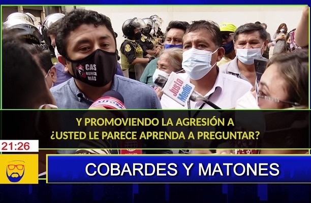 En las imágenes se aprecia que la periodista Claudia Toro se impone en la discusión a un Guillermo Bermejo, desconcertado y que solo atina a mirarla, sin responder la pregunta de la reportera, quien solo en medio de empujones consiguió acercarse al legislador.
